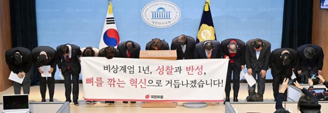 국민의힘 초·재선 의원들이 3일 국회 소통관에서 12·3 비상계엄 사과 기자회견에서 윤석열 전 대통령과 정치적 단절을 선언하며 고개 숙여 사과하고 있다. 민경석 기자 |