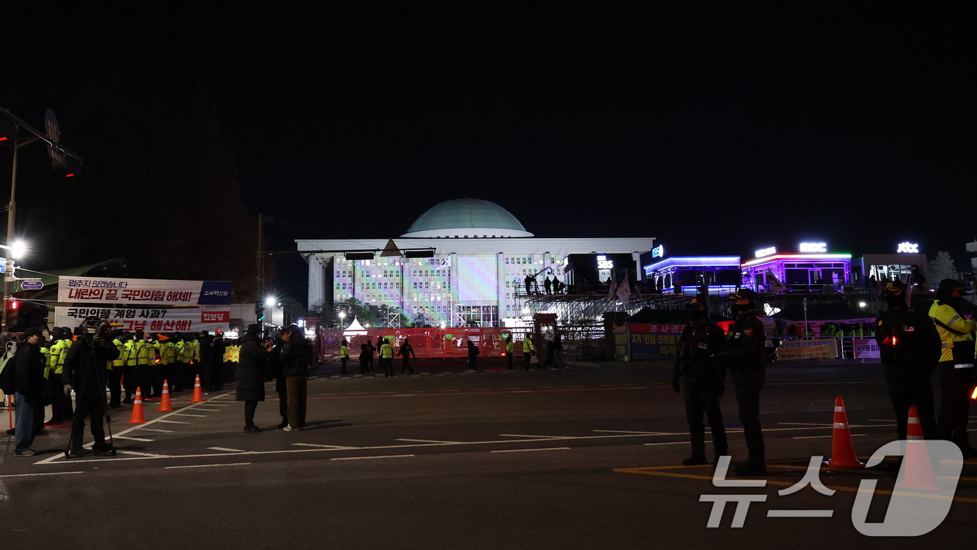 (서울=뉴스1) 박지혜 기자 = 12·3 비상계엄 1년을 맞은 3일 서울 여의도 국회 앞에서 '12·3 내란외환 청산과 종식, 사회대개혁 시민대행진'이 열린 가운데 경찰들이 경계 근무를 서고 있다. 이날 이재명 대통령이 행진에 참석할 예정이었으나 경호 사정으로 최종 불참을 결정했다. 2025.12.3/뉴스1