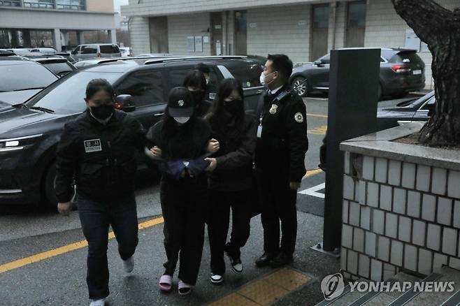 지난달 27일 경기 의정부시 가능동 의정부지방법원에서 아동학대살해 혐의로 구속영장이 청구된 친모 A씨(25)와 계부 B씨(33)가 구속 전 피의자 심문을 위해 법정으로 이동하고 있다. [연합뉴스] |