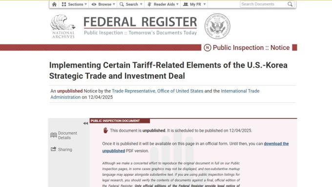 미 상무부 국제무역청(ITA)과 무역대표부(USTR)는 이날 '한미 전략적 무역·투자 협정(U.S.-ROK Strategic Trade and Investment Deal)' 이행을 위한 관세 조정 내용을 연방 관보(Federal Register)에 온라인 사전 게재했다. 공식 게재는 4일 이뤄질 예정이다.