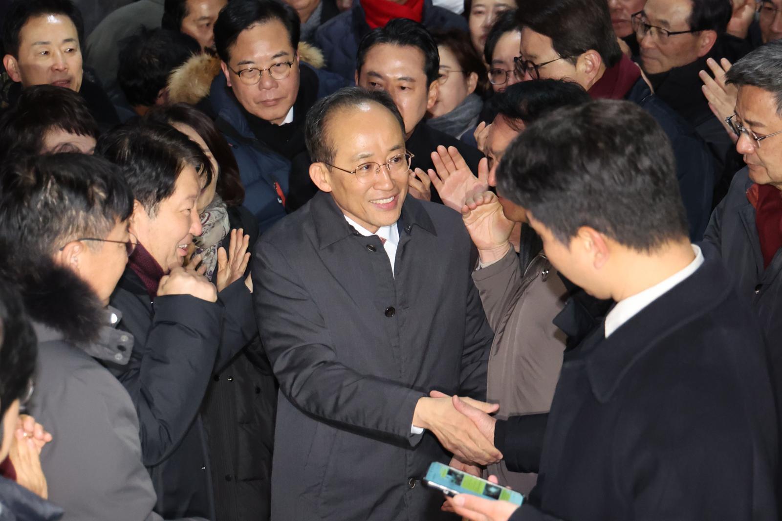 3일 새벽 구속영장이 기각된 뒤 추경호 전 국민의힘 원내대표(가운데)가 서울구치소를 걸어 나오며 구치소 앞에서 대기하던 국회의원들과 인사하고 있다. 내란 특검은 추 전 원내대표에 대해 ‘계엄 해제 표결 방해’ 의혹으로 구속영장을 청구했지만 법원은 ‘혐의 다툼 여지’를 이유로 기각했다. 의왕=뉴시스 |