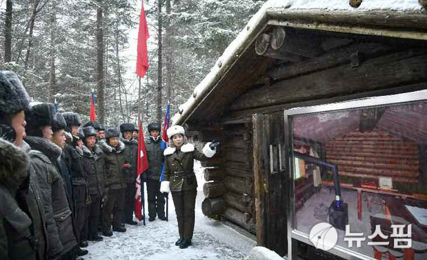 [서울=뉴스핌] 이영종 통일전문기자 = 북한 노동신문이 4일 전한 백두산 혁명전적 답사행군대의 모습. 김정은 국방위원장 출생지로 날조된 '밀영' 앞에서 해설원의 설명을 듣는 장면이다. [사진=노동신문 홈페이지] 2025.12.04 yjlee@newspim.com |
