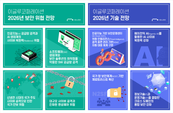 이글루코퍼레이션(대표 이득춘)은 이같은 내용의 ‘2026년 사이버 보안 위협 및 기술 전망 보고서’를 발표했다고 4일 밝혔다. 이번 보고서는 이글루코퍼레이션 보안분석팀의 예측을 토대로 작성됐다.