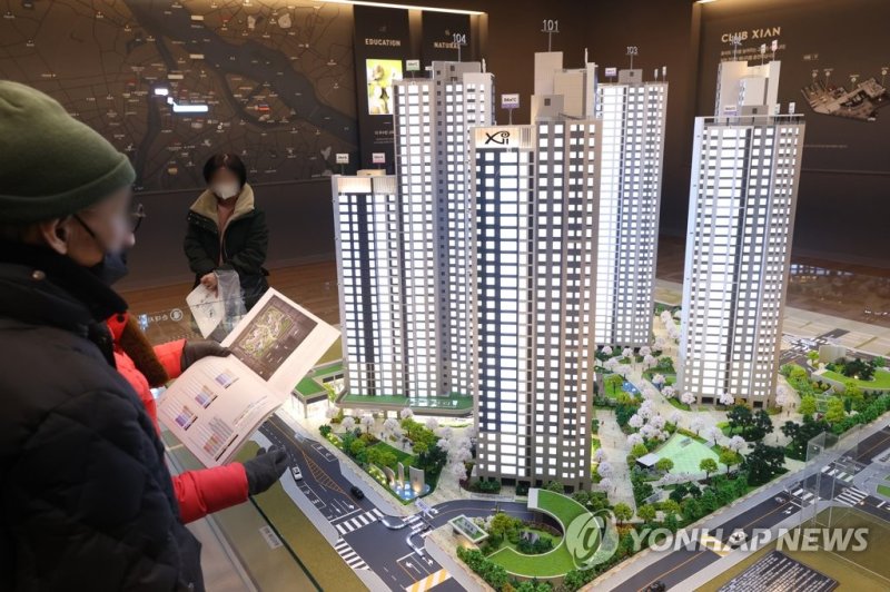 견본주택 방문객들이 단지 모형을 살펴보고 있다. 사진=연합뉴스 |