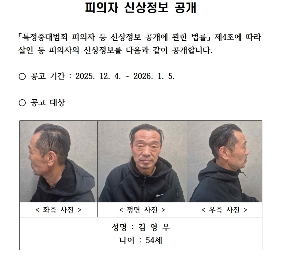 이에 따라 김씨의 이름과 나이, 얼굴은 이날부터 내년 1월 5일까지 30일간 충북경찰청 홈페이지에 게시된다.