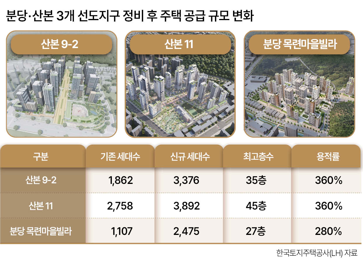연내 특별정비구역 지정이 완료되면 산본 9-2·11구역과 분당 목련마을빌라는 기존 노후주택 약 5700세대에 신규주택 4000세대가 더해져 약 1만세대로 확대된다. 산본 9-2구역은 최고 35층·용적률 360%가 적용돼 3376세대 규모로, 11구역은 최고 45층·용적률 360%돼 총 3892세대 대단지로 조성된다. 분당 목련마을빌라도 1368세대가 증가한 최고 27층, 용적률 280%, 2475세대로 재탄생한다.