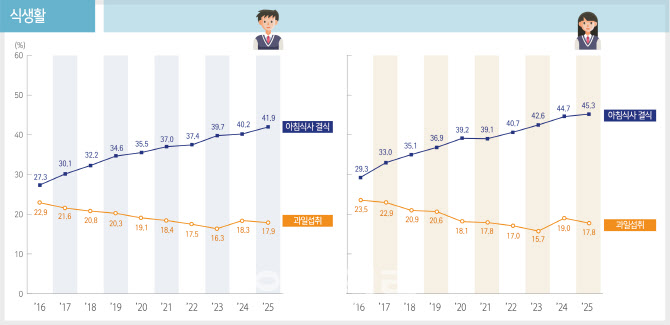 이는 2005년 조사 시작한 이래 최고치다. 조사 첫 해인 2005년에는 남학생 26.4%, 여학생 28.0%만이 아침을 거른다고 답했다. 20년간 남학생은 15.5%포인트, 여학생은 17.3%포인트가 각각 높아졌다.