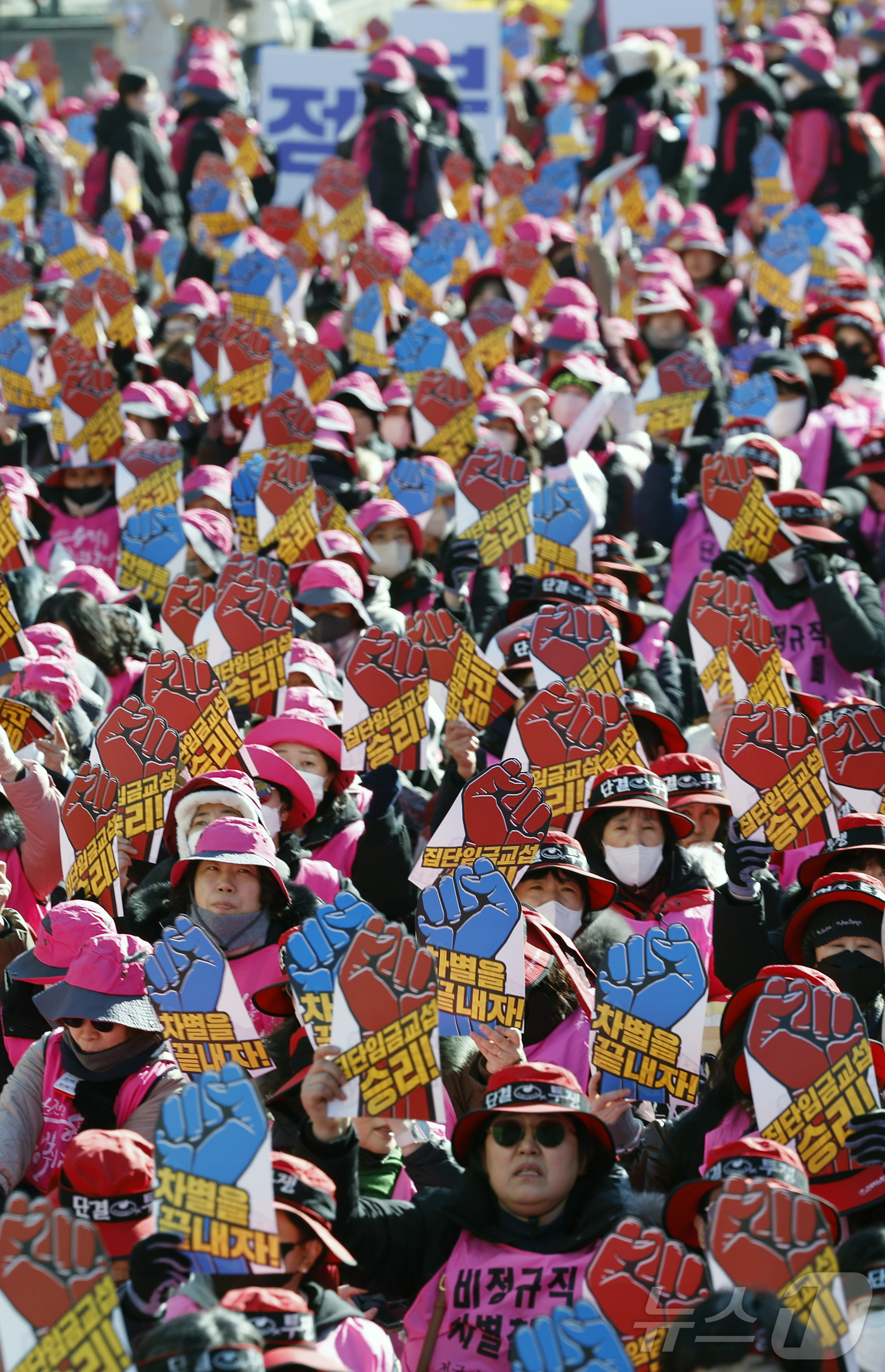 (서울=뉴스1) 박정호 기자 = 전국교육공무직본부, 전국여성노동조합, 전국학교비정규직노동조합으로 구성된 전국학교비정규직연대회의 조합원 등이 4일 오후 서울 여의도 국회의사당 인근에서 가진 전국학교비정규직연대회의 2차 총파업대회에서 손피켓을 들어 구호를 외치고 있다. 전국학교비정규직연대회의는 저임금 차별 철폐와 학교급식법 개정 및 종합대책 마련, 교육공무직 제도화 등을 요구했다. 2025.12.4/뉴스1