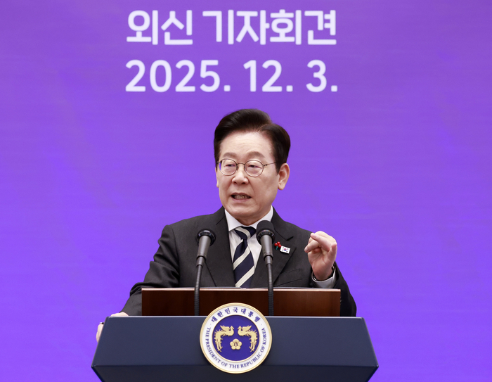 이재명 대통령이 3일 청와대 영빈관에서 열린 ‘새롭게 선 민주주의, 그 1년’ 외신 기자회견에서 답변하고 있다. [대통령실사진기자단] |