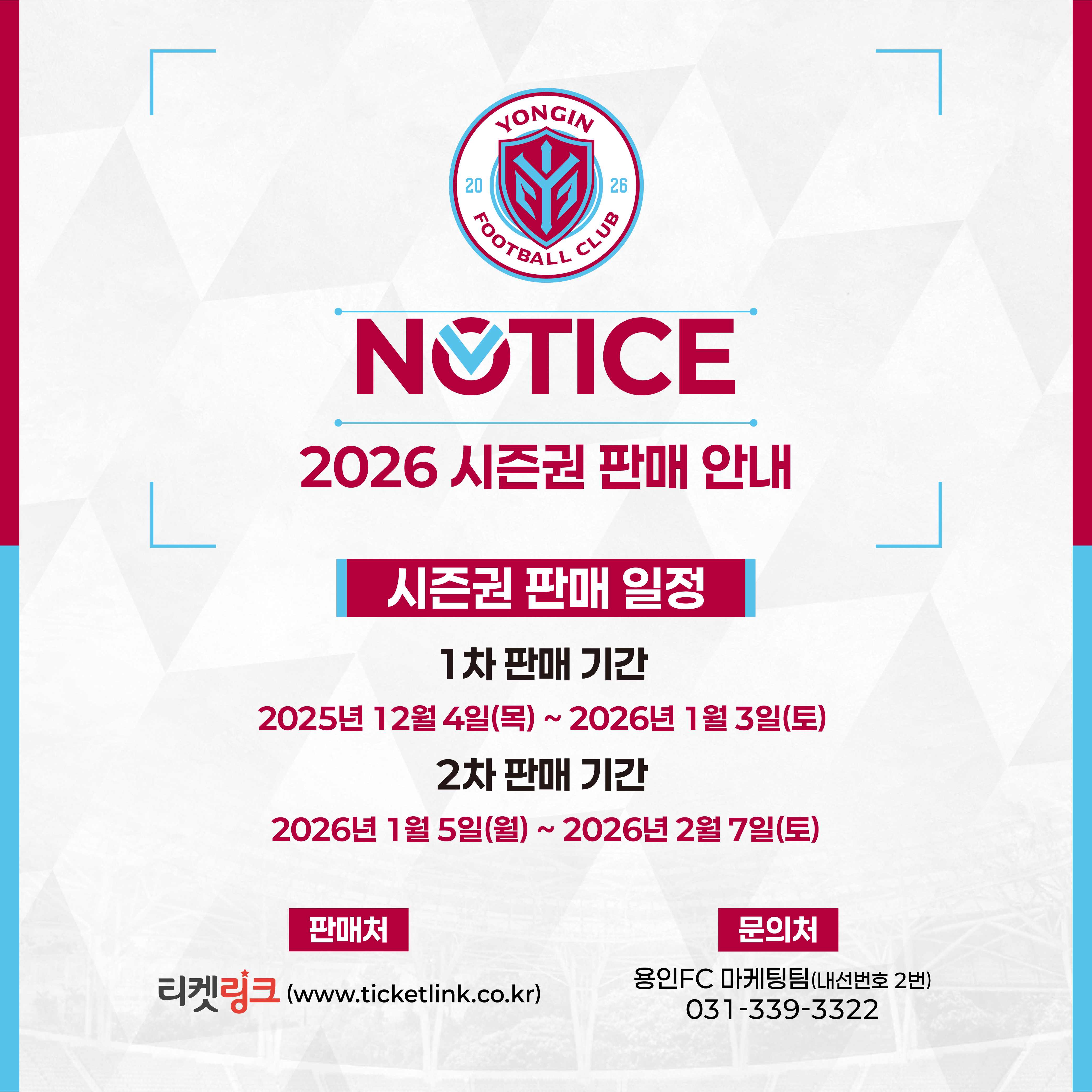시즌권 판매는 1차(25년 12월 4일(목)~26년 1월 3일(토))와 2차(26년 1월 5일~2월 7일(토))로 나누어 진행하며, 구매는 티켓링크(ticketlink.co.kr)를 통해 가능하다. 상품 수령은 택배 또는 현장(구단)방문 수령 중 선택할 수 있으며, 세부 정보는 용인FC 공식 홈페이지 및 티켓링크를 통해 확인할 수 있다.