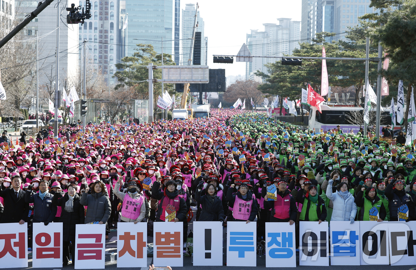전국교육공무직본부, 전국여성노동조합, 전국학교비정규직노동조합으로 구성된 전국학교비정규직연대회의(연대회의)는 4일 오후 서울 영등포구 국회의사당역 2번 출구 앞에서 집회를 열고 "학교 비정규직 차별 해소에 정부와 국회는 응답하라"고 이같이 밝혔다. 이날 집회에는 경찰 비공식 추산 기준 6000~7000명이 참가했다.