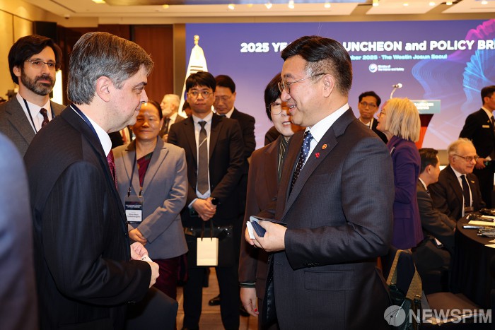 [서울=뉴스핌] 윤호중 행정안전부 장관이 4일 오전 서울 중구 웨스틴조선호텔에서 한국 공공행정의 우수성 등 행정한류의 확산을 위한 주한 외교사절 초청 정책설명회에 참석하여 참석 주한 외교사절단들과 인사 하고 있다. [사진=행정안전부] 2025.12.04 photo@newspim.com