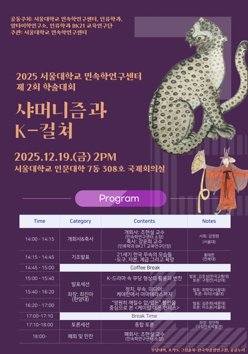 (서울=연합뉴스) 김예나 기자 = 서울대 민속학연구센터는 이달 19일 오후 서울 관악 캠퍼스 인문대학 7동 국제회의실에서 '샤머니즘과 K-컬처'를 주제로 한 학술대회를 연다고 4일 밝혔다.