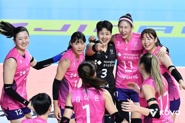 흥국생명 선수들이 3일 인천 삼산월드체육관에서 열린 2025~2026 V리그 한국도로공사와 경기에서 세트 점수 3-2로 승리한 뒤 기뻐하고 있다. 한국배구연맹 제공 |