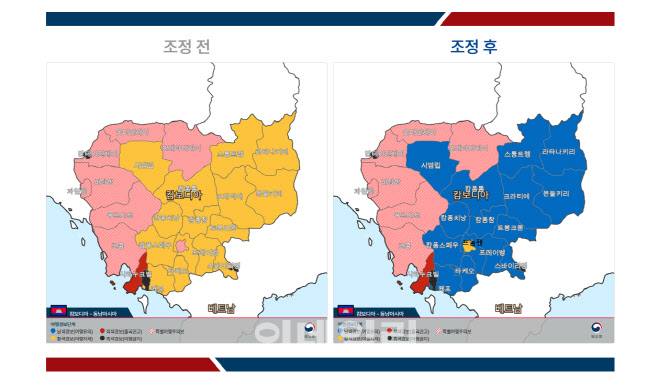 한국인이 많이 찾는 관광지인 시엠레아프(시엠립)는 기존 경보 2단계 ‘여행자제’에서 1단계 ‘여행유의’로 하향 조정됐다. 특별여행주의보(2.5단계)가 내려졌던 수도 프놈펜은 2단계 ‘여행자제’ 지역이 됐다.