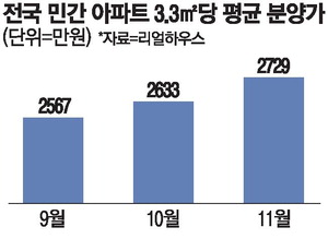11월 전국 민간 아파트의 3.3㎡(1평)당 분양가가 2700만원을 넘어섰다. 공사비가 꾸준히 오르는 만큼 아파트 분양가 역시 계속 상승할 것이라는 전망이 나온다.