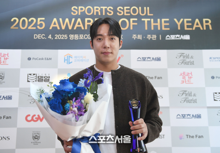 이날 시상식에서는 삼성 라이온즈 투수 원태인이 ‘올해의 투수상’을 수상했다. 평소 야구 실력만큼 훤칠한 외모로도 주목 받는 원태인은 남친룩 패션으로 포토월 무대에 올라 팬들의 시선을 사로잡았다.