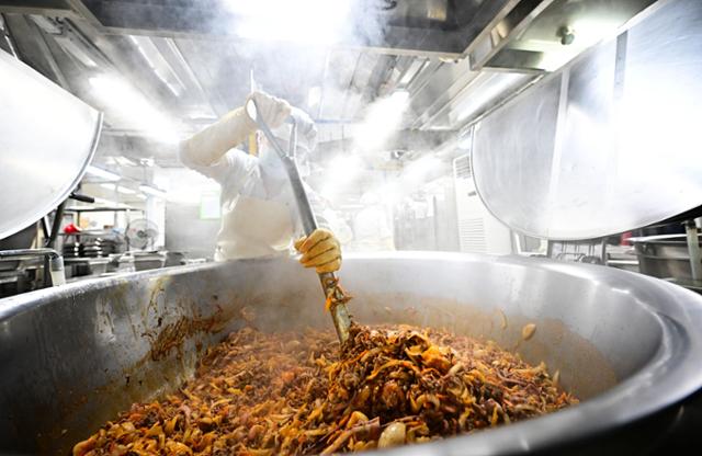 지난해 10월 대구의 한 고등학교에서 중화비빔밥 소스를 조리하는 조리실무사 주변에 뿌연 연기가 가득 차 있다. 기름을 사용해 튀김, 볶음 요리를 할 때 나오는 조리흄(매연)은 급식노동자들에게 폐암을 유발하는 주범으로 꼽힌다. 대구=최주연 기자 |