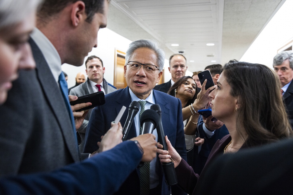 3일(현지시간) 미국 워싱턴DC 상원 사무실에서 젠슨 황 엔비디아 최고경영자(CEO)가 기자들 앞에서 발언하고 있다. 황 CEO는 이날 도널드 트럼프 미국 대통령과 만나 인공지능(AI) 반도체 수출통제 문제를 논의했다고 밝혔다. EPA연합뉴스 |