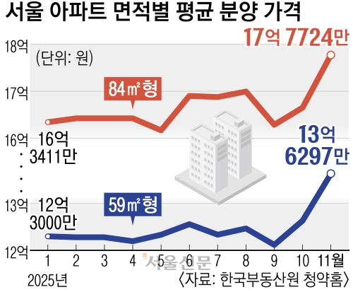 전용 84㎡의 전국 평균 분양가도 전월 대비 3.44% 오른 6억 9595만원으로 최고치를 경신했다. 특히 서울은 17억 7724만원으로, 전국 평균의 2.5배에 달했다. 지난해 10월 18억 1247만원으로 최고를 찍은 이후 올해 1월 16억원대로 낮아졌지만, 공사비·택지비 상승과 맞물리며 점차 오르다 지난달 17억원대로 들어선 것이다.