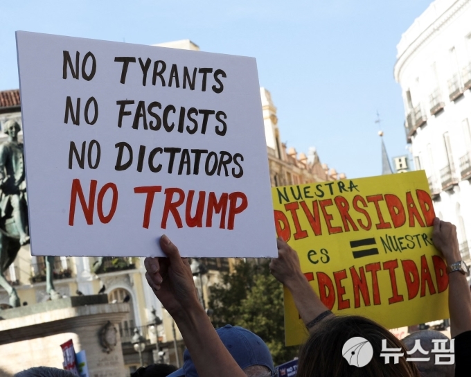 2025년 10월 스페인 마드리드에서 열린 '노 킹스(No Kings)' 집회에서 참가자들이 도널드 트럼프 미국 대통령에 반대하는 플래카드를 들고 있다. [사진=로이터 뉴스핌] |