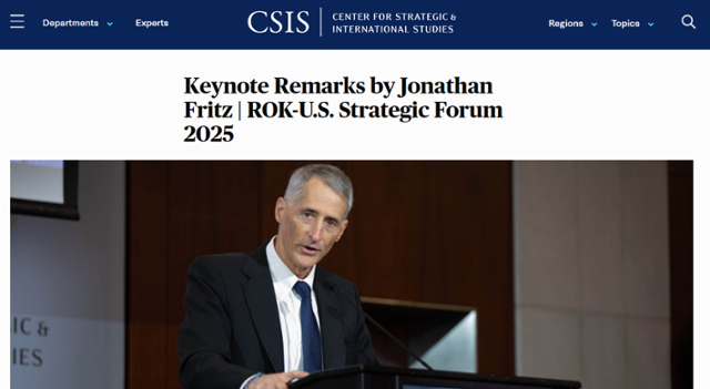 조너선 프리츠 미 국무부 선임 부차관보는 3일(현지시간) 워싱턴에서 열린 한국국제교류재단(KF)과 전략국제문제연구소(CSIS) 주최 포럼 기조연설에서 도널드 트럼프 대통령이 한국의 핵잠 건조에 지지를 표명한 점을 거론하며 "역내 위협에 대항할 한미의 집단적 역량을 진전시키는 양자 협력의 명백한 사례"라고 말했다. '역내 위협'은 통상적으로 중국의 인도·태평양 지역에서의 군사적 팽창을 겨냥할 때 사용하는 표현이다.