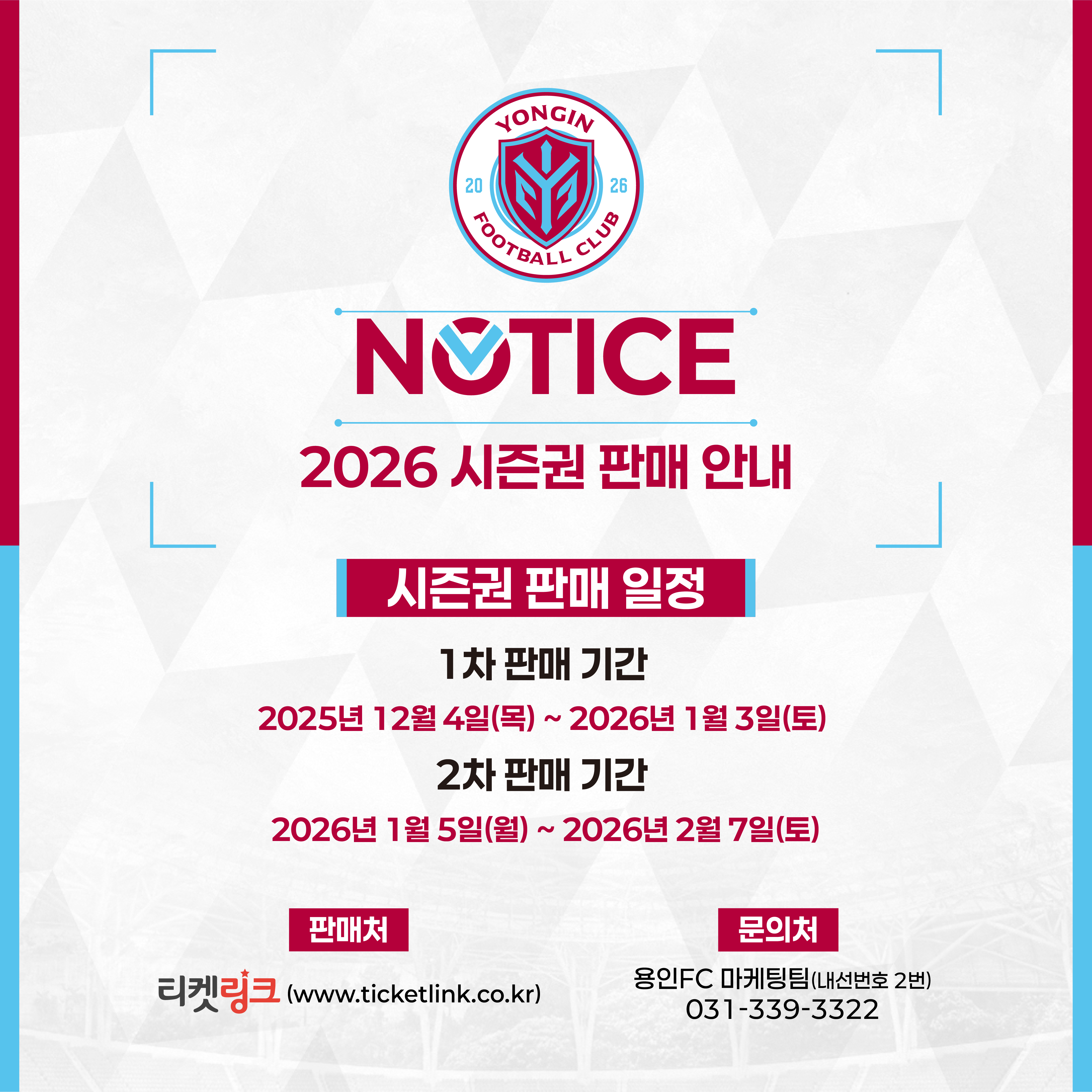 시즌권 판매는 1차와 2차로 나눠서 진행한다. 1차는 12월4일부터 2026년 1월3일까지다. 2차는 2026년 1월5일부터 2월7일까지다. 구매는 티켓링크를 통해 가능하다. 상품 수령은 택배 또는 현장(구단)방문 수령 중 선택할 수 있다. 세부 정보는 용인FC 공식 홈페이지 및 티켓링크를 통해 확인할 수 있다.