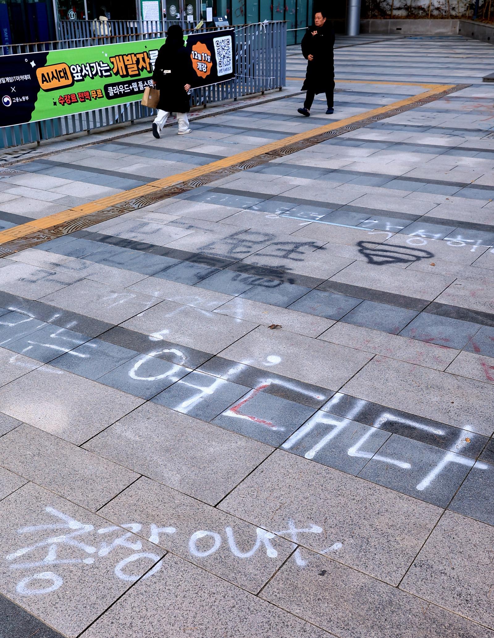 동덕여자대학교와 학생들은 4일 캠퍼스 건물 공학 반대 항의 래커 제거 행사와 공학전환 강행 반대 시위를 각각 계획예정이었으나 동덕여대를 겨냥한 흉기난동 예고 글이 인터넷에 올라오면서 두 일정을 잠정 연기했다. 사진은 이날 서울 성북구 동덕여자대학교에 공학 전환 반대 관련 래커칠이 남아있는 모습. 2025.12.4/뉴스1 |