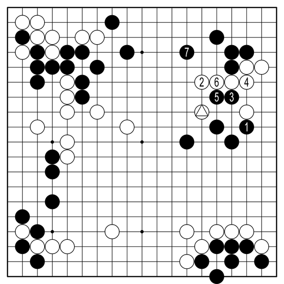 장면⑤=바둑은 최후에 집으로 승부한다. 그 집을 미리 헤아리는 게 형세 판단인데 이 판의 경우 ‘집’을 세기 매우 어렵다. 그러나 집도 생사에 비하면 별거 아니다. 쫓기면 집이 다 사라질 수 있다. 두터움과 엷음, 공격과 수비는 집보다 중요하다.