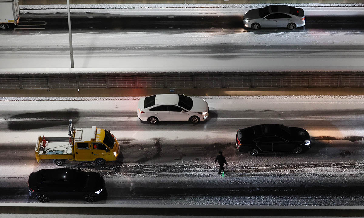4일 서울 서대문구 홍제동 내부순환로에서 차량이 얼어붙은 눈길에 서행하는 가운데 내부순환로에서 시설관리공단 관계자가 제설 작업을 하고 있다. 연합뉴스 |