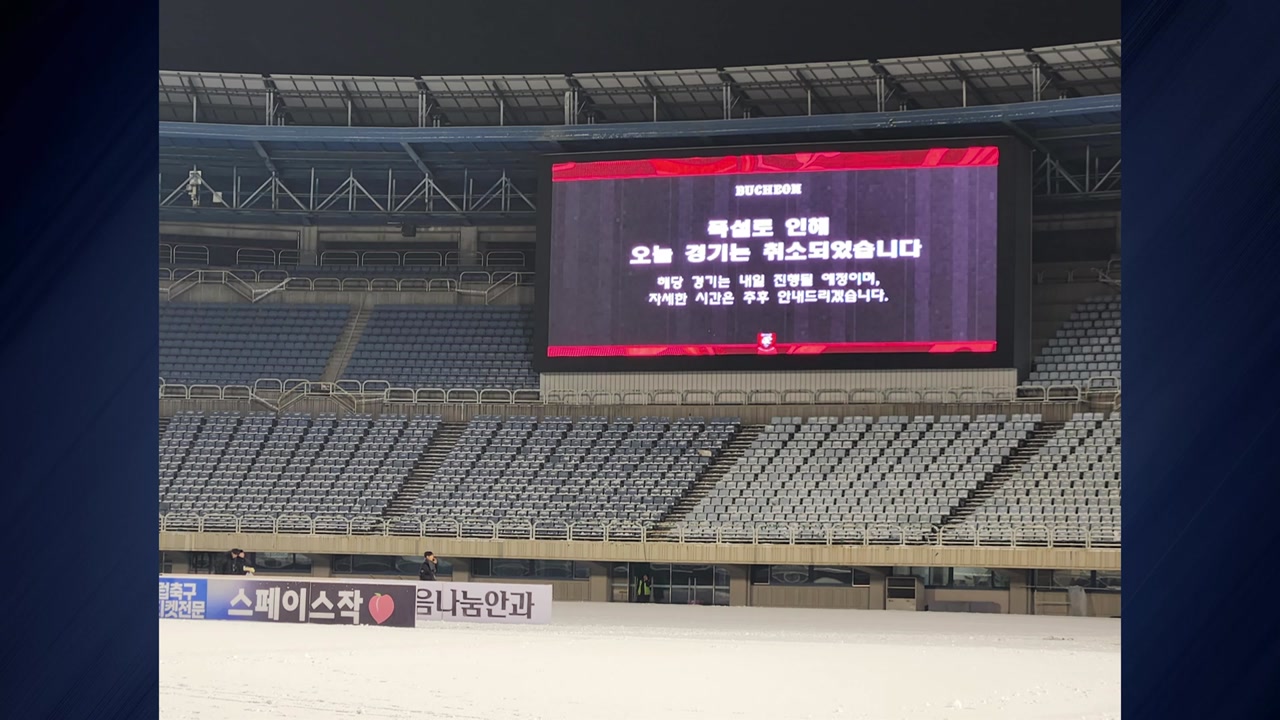 1차전 경기는 어제(4일) 저녁 7시 부천종합운동장에서 열릴 예정이었지만, 많은 눈이 쏟아지면서 그라운드를 뒤덮은 눈을 치우느라 경기 시작이 미뤄지다가 결국 취소됐습니다.