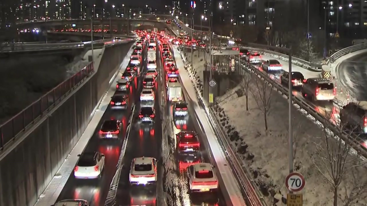 수도권에서는 저녁 퇴근 시간 두 시간 정도 기습 폭설에 도로 곳곳이 마비됐습니다.