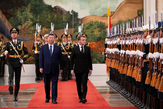 시진핑 중국 국가주석(왼쪽)과 에마뉘엘 마크롱 프랑스 대통령이 4일 베이징 인민대회당에서 정상회담을 앞두고 의장대를 사열하고 있다. 시 주석은 미국을 겨냥하며 “다자주의를 함께 실천하자”고 강조했고, 마크롱 대통령은 ‘하나의 중국’ 원칙을 존중한다면서 우크라이나 문제와 관련, 유럽의 입장을 지지해달라고 촉구했다. 두 정상은 5일 쓰촨성 청두에서 회담을 이어간다. [로이터=연합뉴스]