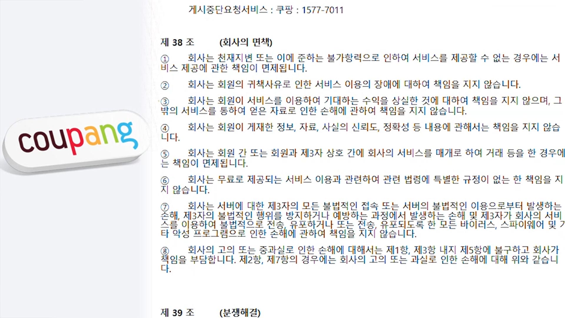 유통업계에 따르면 쿠팡은 약 1년 전 회사 이용 약관 제38조 '회사의 면책' 부분을 추가했습니다.