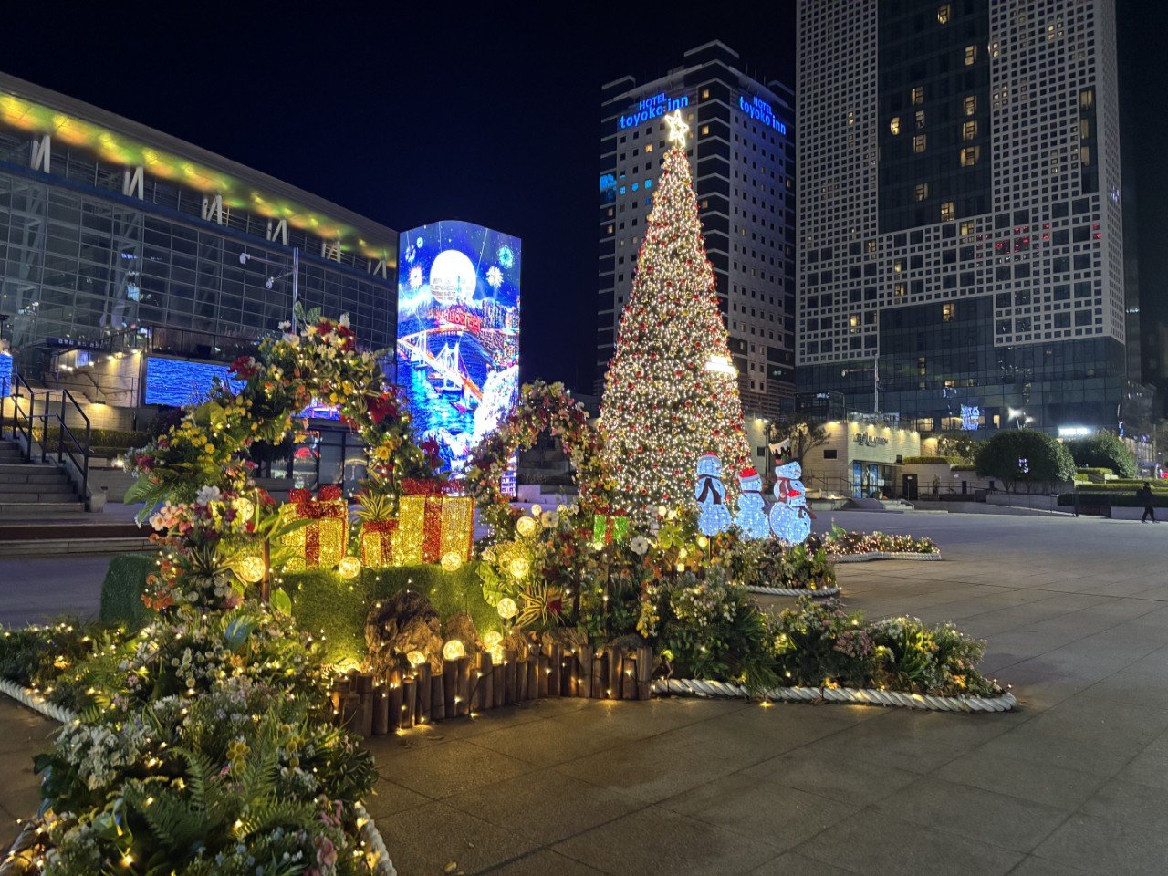 부산 동구 부산역 광장에 조성된 트리정원. 부산시설공단은 6m 높이의 메인트리와 다양한 빛 조형물을 설치해 내년 1월 말까지 운영한다.