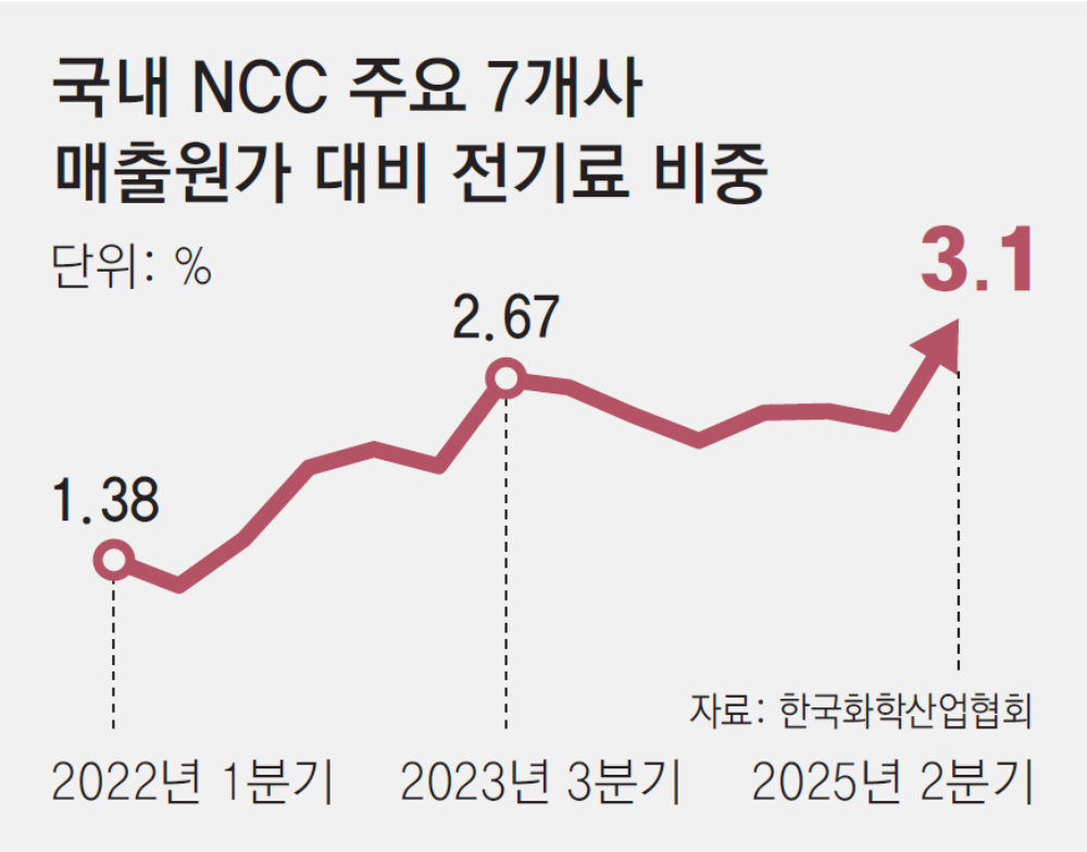 4일 한국화학산업협회에 따르면 올해 2분기(4∼6월) 국내 주요 NCC 업체 7곳(LG화학, 롯데케미칼, SK지오센트릭, 한화토탈에너지스, 대한유화, 여천NCC, HD현대케미칼)의 매출원가(제품 생산을 위해 사용한 비용) 대비 전기료 비중은 3.10%로 집계됐다. 직전 분기(2.35%) 대비 0.75%포인트 오른 것으로, 산업용 전기요금 인상 사이클이 본격화한 2022년 2분기(1.20%)와 비교하면 1.9%포인트나 상승했다.