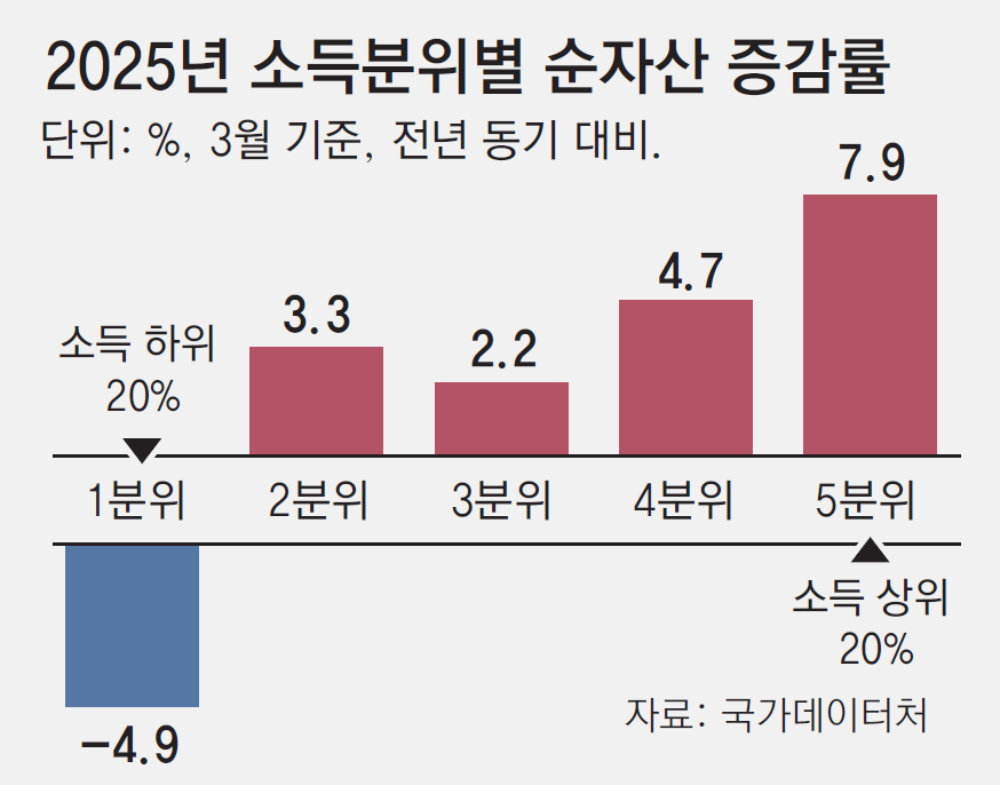 수도권 부동산 등 실물자산 가격이 상승하면서 자산 양극화 현상도 뚜렷해졌다. 소득분위별로 전체 자산에서 부채를 뺀 순자산은 1분위에서만 4.9% 감소했다. 반면 2분위(3.3%), 3분위(2.2%), 4분위(4.7%), 5분위(7.9%)는 모두 순자산이 늘었다.