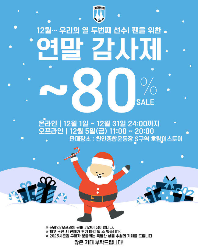 천안시민프로축구단(천안시티FC)은 12월 한 달간 구단 공식 MD를 특별 할인된 가격으로 제공하는 '연말 감사제' 이벤트를 진행한다. 이번 행사는 한 해 동안 구단을 응원해준 팬들에게 보답하기 위해 마련됐다.
