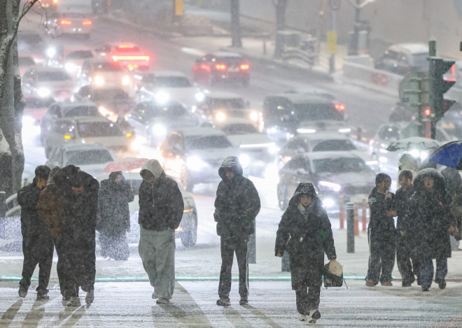 첫눈 쏟아진 서울 ‘대설 재난문자’ … 오늘 출근길 빙판 주의 - 4일 오후 서울 중구에 눈이 내리는 가운데 퇴근길 시민들이 몸을 웅크린 채 발걸음을 재촉하고 있다. 이날 첫눈이 내린 서울 전역과 수도권 등은 대설주의보가 발효됐다. 기상청은 서울과 경기 곳곳에 ‘시간당 5㎝ 이상 눈이 쏟아져 교통에 불편이 초래될 수 있다’는 내용의 ‘대설 재난문자’를 처음 발송했다. 5일 아침 최저기온은 영하 11도에서 영상 2도로, 쌓인 눈이 얼어붙을 것으로 예상됨에 따라 출근길 각별한 주의가 요구된다. 뉴시스 |