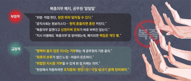 지난 달 25일 정부가 공무원법상 공무원 ‘복종의무’를 폐지하겠다고 발표한 이후 공직사회 온도 차가 뚜렷하다. ‘뒤늦은 조치’라는 환영의 목소리도 있지만, ‘책임만 실무자에게 더 쏠릴 것’이라는 우려 역시 만만치 않다. 국가공무원법과 지방공무원법에서 76년 만에 ‘복종 의무’ 조항이 사라지면서 상관의 위법한 지시를 거부할 수 있는 길이 열렸지만, 실제 현장에서 제도가 어떻게 작동할지는 여전히 안갯속이다.