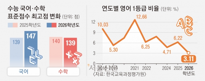 지난달 치러진 2026학년도 대학수학능력시험(수능) 채점 결과 지난해보다 전반적으로 어려웠던 것으로 나타났다. 특히 1등급 비율이 역대 최저치를 기록할 만큼 고난도였던 영어영역과 까다로웠던 국어영역이 당락에 영향을 미칠 것으로 보인다.