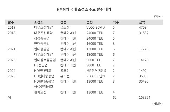 5일 업계에 따르면 HMM은 2017~2025년 국내 조선소에 주요 선종 기준 10조3754억원 규모 62척을 발주했다. 올해 들어서만 HD현대중공업(30만t 규모 VLCC, 3633억원), 1만3000TEU 규모 컨테이너선이자 LNG 이중연료선인 HD현대중공업+HD현대삼호(8척) 및 한화오션(4척) 총 3조490억원 등 3조4123억원어치를 발주했다. 지난 2018년 대우조선해양(현 한화오션) 2만4000TEU 7척, 삼성중공업 2만4000TEU 5척, HD현대중공업 1만6000TEU 8척 등 3조1532억원어치 컨테이너선을 발주한 기록을 경신했다.
