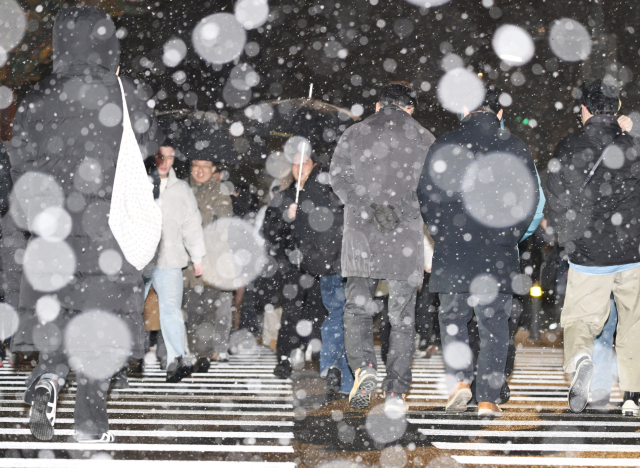 서울에 첫눈이 내린 4일 서울 종로구 거리에서 시민들이 퇴근길 발걸음을 재촉하고 있다. 5일 전국의 아침 최저기온이 -11∼2도, 낮 최고기온은 1∼9도로 추운 날씨가 이어지면서 전날 내린 눈으로 인해 아침부터 빙판길이 예상된다. 오승현 기자 2025.12.04