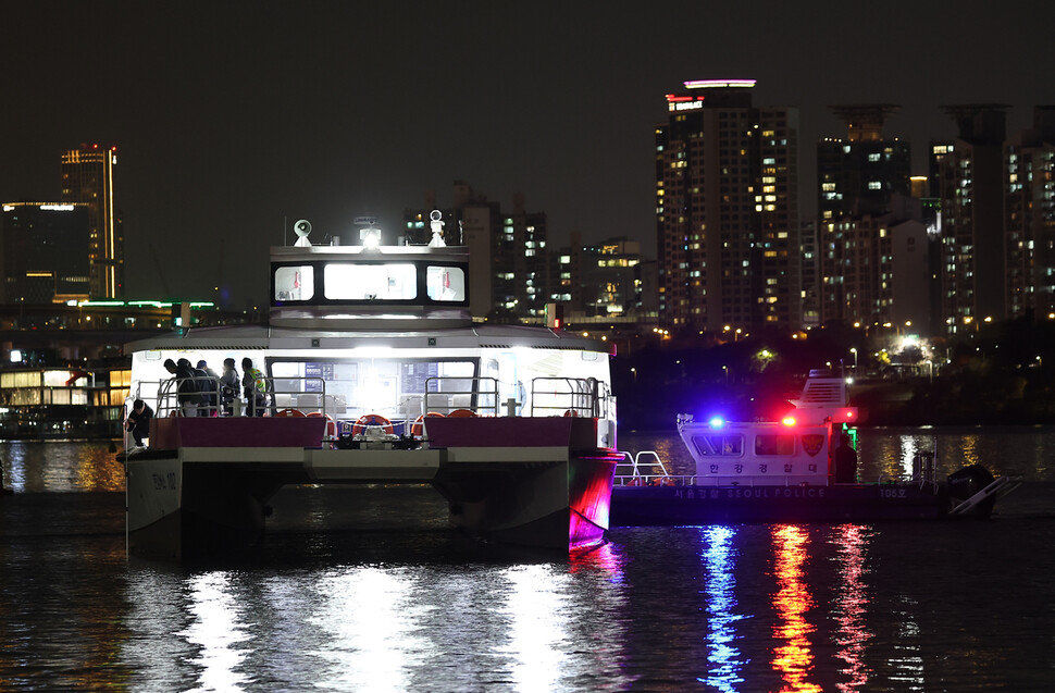 15일 서울 한강버스가 서울 송파구 잠실선착장 인근 강바닥에 걸려 멈추자 한강경찰대 선박이 옆에 접안해 있다. 배에 탑승해 있던 승객 80여명은 소방 당국과 서울경찰청 한강경찰대가 출동해 구조됐다. 연합뉴스 |