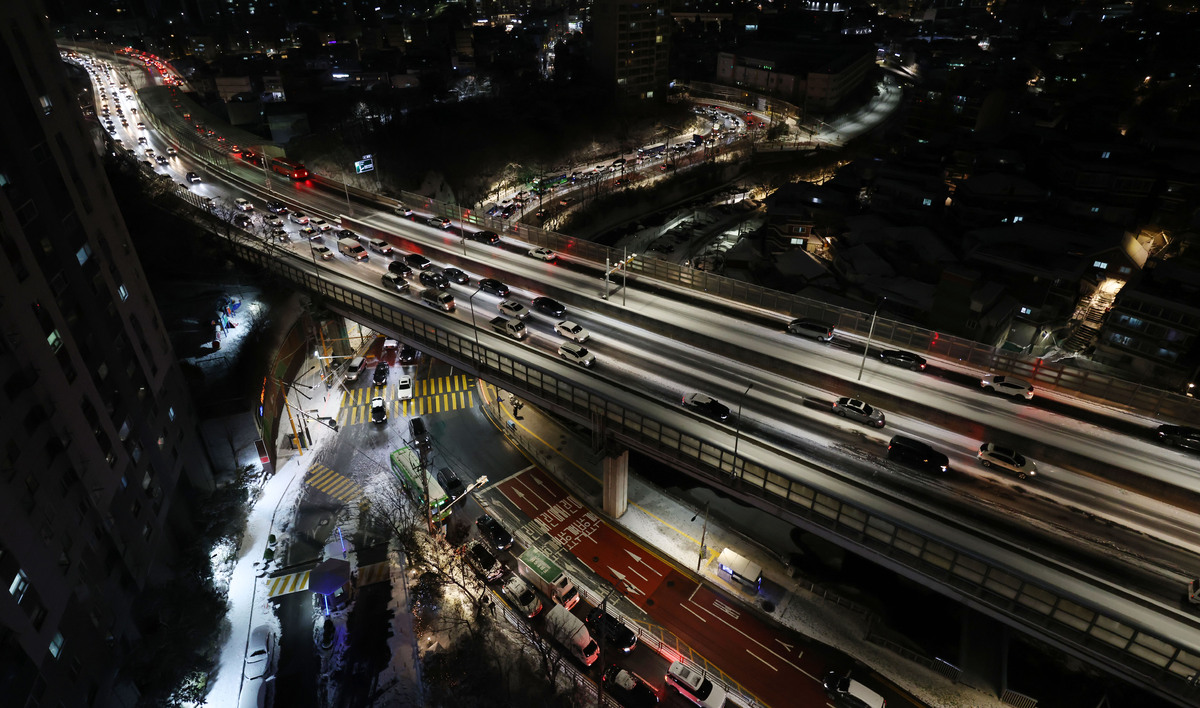 올겨울 많은 양의 첫눈이 내린 지난 4일 서울 서대문구 홍제동 내부순환로에서 차량이 얼어붙은 눈길에 서행하고 있다. 연합뉴스 |