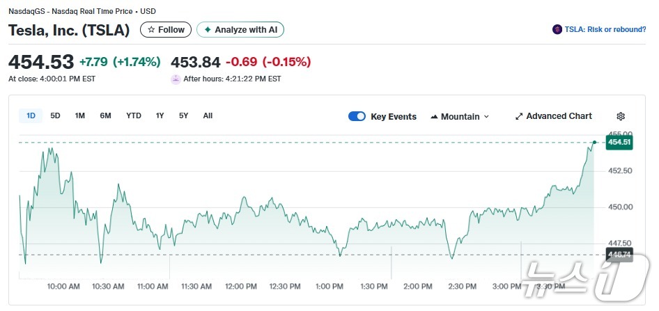 4일(현지 시각) 뉴욕증시에서 테슬라는 1.74% 상승한 454.53달러를 기록했다. 이로써 시총도 1조5120억달러로 불었다.