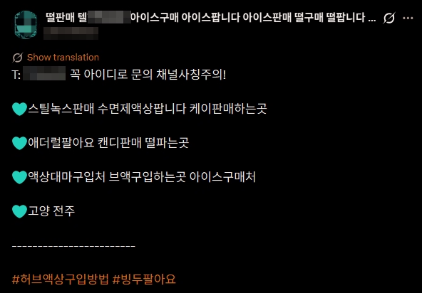 엑스(옛 트위터)에 마약 구매를 검색하면 나오는 계정들. 대놓고 마약을 취급한다고 광고하고 있다. 대개는 텔레그램 아이디로 연락을 하도록 유도한다. |