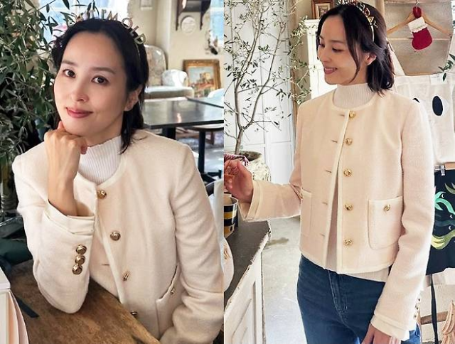 한혜진은 최근 자신의 SNS에서 아이보리 컬러의 라운드넥 트위드 재킷을 공개했다. 화사하면서도 단정한 분위기를 담은 이 스타일은 골드 버튼 디테일이 포인트가 돼 고급스러움을 더했다. 자연스럽게 떨어지는 노카라 실루엣은 얼굴선을 깔끔하게 정리하며 세련된 인상을 완성했다.