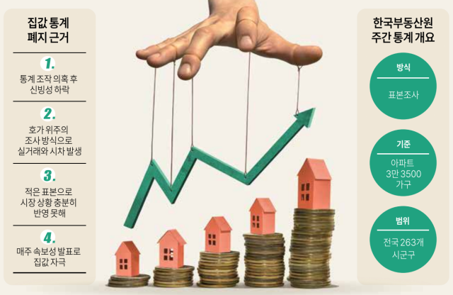 이후 집값 통계 무용론이 대두됐다. 부동산원이 매주 발표하는 '주간 아파트 가격 동향'은 조사원 300명이 3만2000가구를 대상으로 조사하는 표본통계다. 조사원들은 표본의 매물과 호가, 실거래 가격 등을 직접 조사한다. 계약 완료 후 신고까지 최장 1개월 정도 시차가 발생할 수밖에 없는 구조다. 표본이 적고 호가에 의존하는 한계 때문에 시장을 정확히 반영하지 못한다는 지적이 뒤따른다.