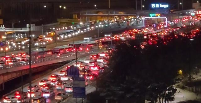 서울·인천·경기·강원 등 4개 시도에 대설특보가 발효된 4일 경부고속도로 판교톨게이트 진입로에 차량이 몰려 정체를 빚었다. [사진=연합뉴스] |